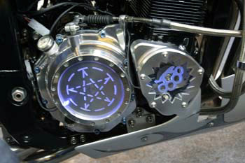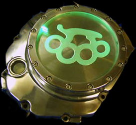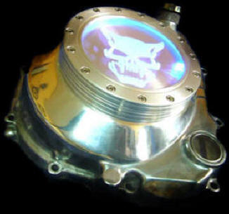 Der Kupplungsdeckel ist mit einer Plexiglas- scheibe im inneren ausgestattet, als Design ist ein Schlagring der beleuchtet wird. Die Scheibe ist in einer CNC Halterung und ist einfach zu montieren. Der CNC Träger wird mit 4 Schrauben am Kupplungsdeckel montiert. Das heißt 4. kleine 5 mm Löcher in den Kupplungsdeckel bohren. Eine genaue Anleitung liegt bei. Die Beleuchtung erfolgt mittels LED´s und wird an 12 Volt angeschlossen. Als Beleuchtungsfarbe können Sie wählen: Blau, Grün, Rot oder Rot /Grün in einer Led wechselbar. |